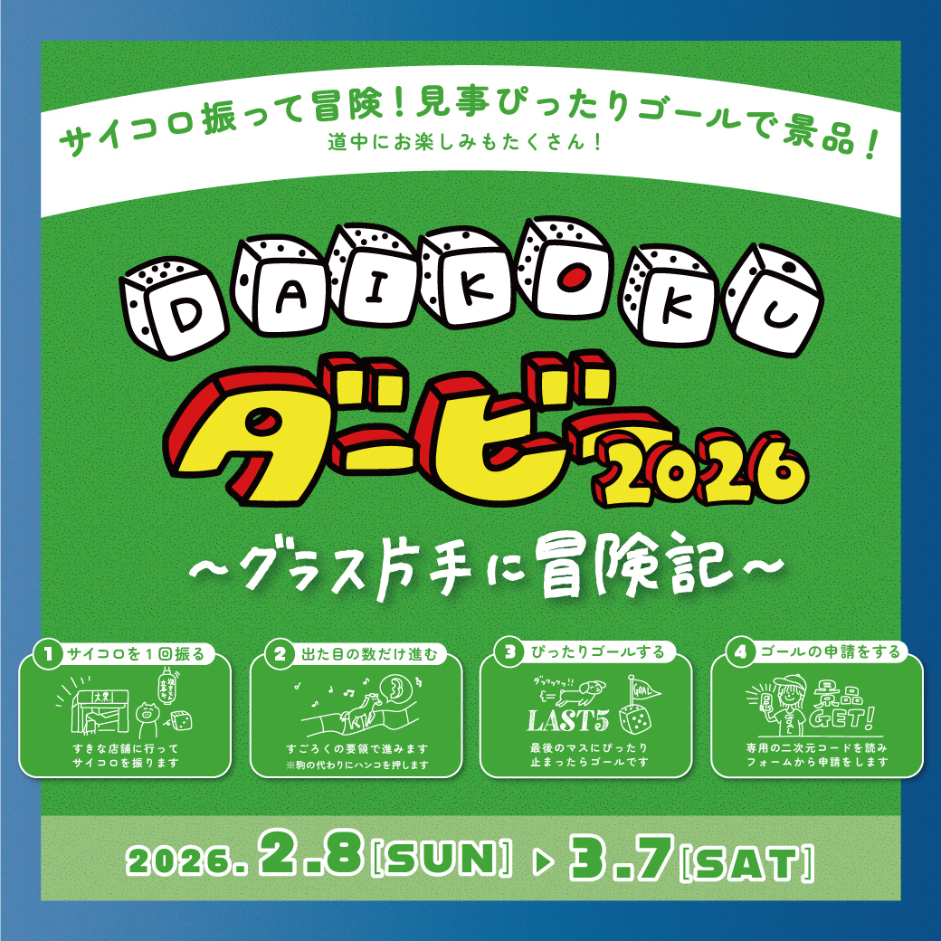 昨年大好評だったすごろく企画の大復活! 2/8(日)~<DAIKOKUダービー 2026>を開催いたします!!! ゴールまでの間には、お楽しみマスがたくさんあるので、ゴールできなくてもお楽しみいただけます♪ どなたでもご参加いただけますので、ぜひご参加ください!
